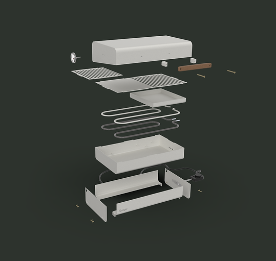 My proposal is a compact, modular, and dishwasher-safe device, conceived for everyday use in the kitchen. It includes a smoking system that brings back part of the flavor and ritual of cooking over fire, but without flames, smoke, or risks, while also offering a healthier way of cooking by avoiding the use of added oils. This project developed both the technical and aesthetic aspects, combining design and engineering to achieve a realistic product, with feasible production methods and technical solutions adapted to daily life.